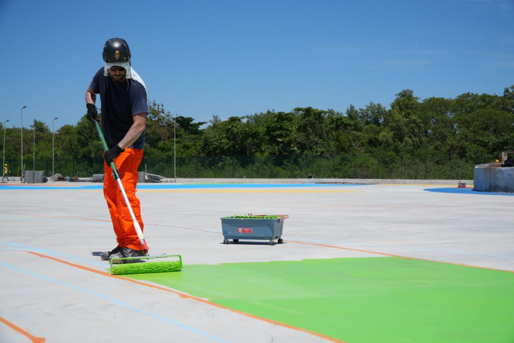 Para completar, uma grande arte gráfica de linguagem minimalista colore o piso da área de shows e outros pontos do parque. Além de valorizar o ambiente, a intervenção funciona como base visual para as placas informativas, reforçando a identidade do Parque RJ São Gonçalo e suas raízes na arte urbana. São Gonçalo é reconhecida como o berço do graffiti no Estado do Rio de Janeiro.