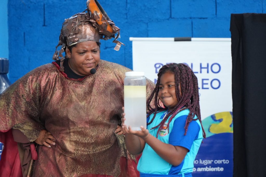 Além da entrega, os alunos da Escola Valéria de Mattos Fontes também puderam assistir à apresentação teatral “De olho na Oleosa”, sobre o descarte correto do óleo de cozinha, de forma lúdica e divertida. A ideia é que os alunos se tornem multiplicadores do conhecimento para os adultos dentro de casa.