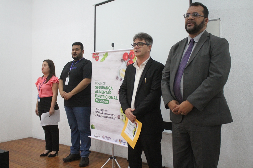 Integraram a mesa do fórum Diego Nascimento, coordenador da Vigilância Socioassistencial, Carla Cristina Gomes da Silva, nutricionista da Secretaria Municipal de Educação, Priscila Rafaela Fabrício Lima, nutricionista do Restaurante do Povo e, representando o Legislativo, o vice-presidente da Câmara de Vereadores de São Gonçalo, vereador Vinícius.
