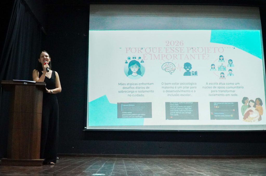 A diretora da Escola Municipal Darcy Ribeiro, Fabiana Rosário, contou a experiência que teve em sua escola com o acolhimento das famílias. “Na nossa escola, a gente pensou que, se nós cuidarmos da mãe, da família, a gente consegue fazer um trabalho melhor com o filho. Então, começamos o projeto ‘Mães Fortalecidas, Filhos Felizes’ em 2023, com acolhimento aos responsáveis. Temos muito orgulho desse projeto”, disse.