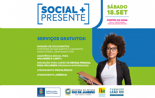 A Prefeitura de São Gonçalo, através da Secretaria de Políticas sobre Álcool e Drogas, e o Governo do Estado do Rio de Janeiro, através Secretaria de Estado de Desenvolvimento Social e Direitos Humanos, vão realizar neste sábado (18) a ação Social + Presente, das 10h às 14h, no bairro Portão do Rosa, com objetivo de levar diversos serviços gratuitos para a população, aproximando o gonçalense do poder público. O evento será realizado no Instituto Eprofe, antigo Educandário Ester Prét .