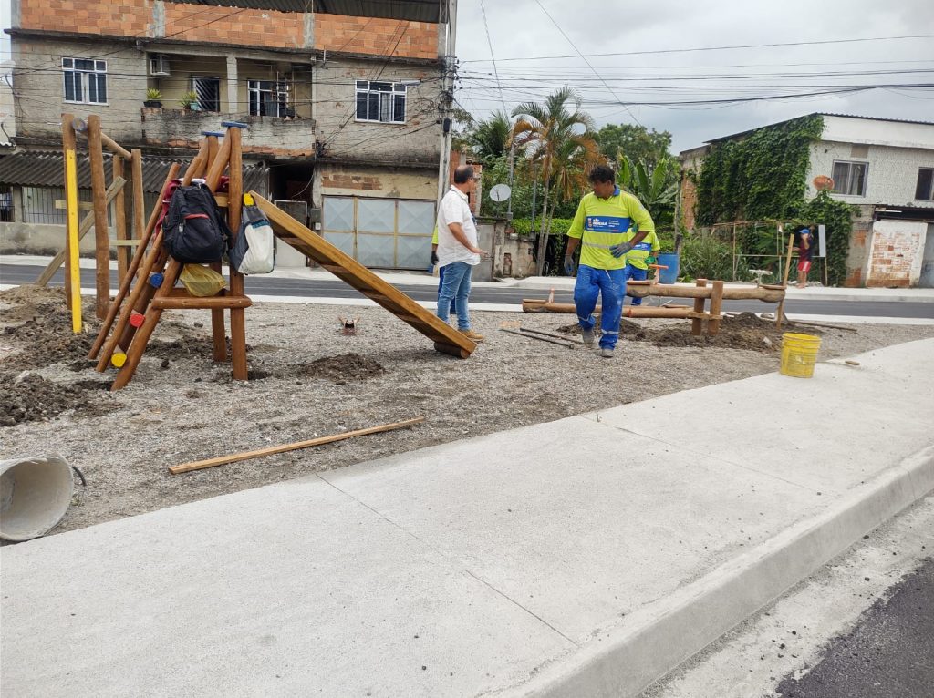 O espaço recebeu calçamento após a pavimentação e os brinquedos começaram a ser instalados esta semana. Após esta etapa, será iniciado o paisagismo no local.