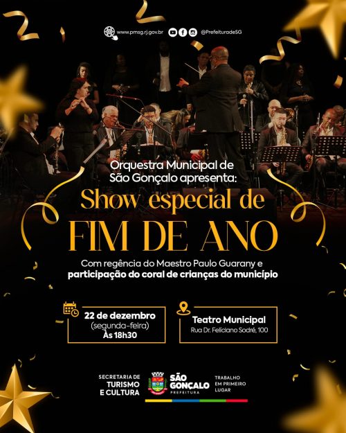 Nesta segunda-feira (22), às 18h30, o Teatro Municipal de São Gonçalo vai receber um show especial de final de ano com a Orquestra Municipal de São Gonçalo e participação do coral de crianças do município. A noite promete emocionar o público com um espetáculo gratuito para todas as idades.