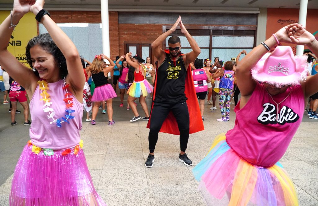 A entrada do Partage Shopping foi tomada por foliões fantasiados e muitos sorrisos durante o aulão ‘Zumba Folia’, com foco no Carnaval, do projeto “Qualidade de Vida e Longevidade”, da Secretaria de Esporte e Lazer da Prefeitura de São Gonçalo, nesta manhã de quarta-feira (11). Mais de 100 pessoas de diversos núcleos da cidade estavam fantasiadas, dançando músicas sob o comando de 12 professores do projeto.