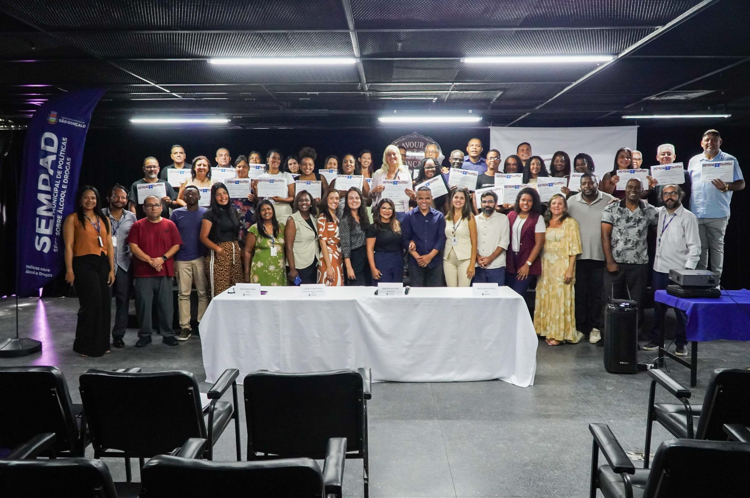 A Secretaria de Políticas sobre Álcool e Drogas da Prefeitura de São Gonçalo realizou, neste sábado (18), a entrega dos certificados da capacitação “SEMPAD em Rede”, no Centro Cultural Joaquim Lavoura, no Centro. O curso teve como objetivo de oferecer suporte efetivo, por meio de conteúdo gratuito em EAD, para agentes acolhedores das comunidades terapêuticas. O evento também teve a apresentação do diagnóstico realizado sobre a rede de cuidado e recuperação do município.
