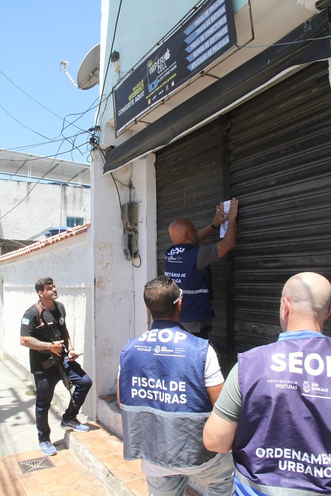 Uma loja no Paraíso, que havia sido interditada por falta de alvará de funcionamento, foi multada e interditada novamente. Uma outra no mesmo bairro foi intimada a regularizar o estabelecimento. No Gradim, um comércio que tinha sido alvo da Polícia Civil foi interditado. Na primeira ação, o proprietário foi levado para a delegacia por estar com um celular roubado. E uma quarta em Vila Lage, que tinha sido interditada, estava fechada.