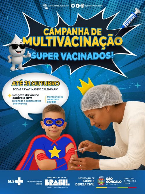 A Secretaria de Saúde da Prefeitura de São Gonçalo começa, nesta segunda-feira (6), a Campanha Nacional de Multivacinação para atualização da caderneta de vacinação. Responsáveis pelas crianças e adolescentes de 0 a 14 anos, 11 meses e 29 dias devem procurar um dos 59 postos de saúde receber os imunizantes. A vacina contra o HPV também está disponível para os adolescentes entre 15 e 19 anos que ainda não se vacinaram. A campanha segue até o dia 31 de outubro e terá o Dia D no dia 18 de outubro.