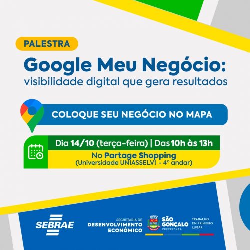 A Secretaria de Desenvolvimento Econômico da Prefeitura de São Gonçalo irá realizar, no próximo dia 14, a palestra ‘Google Meu Negócio: Visibilidade digital que gera resultados’, em parceria com o Serviço Brasileiro de Apoio às Micro e Pequenas Empresas (Sebrae).