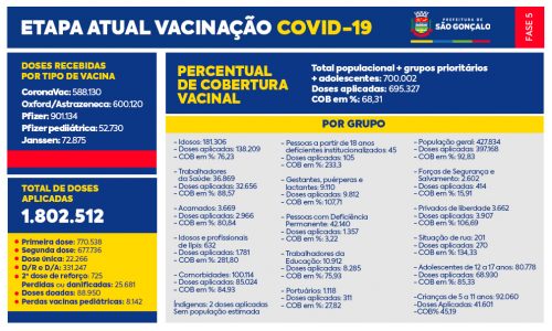 São Gonçalo já aplicou 1.802.512 doses de vacinas contra o coronavírus. A Secretaria Municipal de Saúde e Defesa Civil de São Gonçalo aplicou 770.538 imunizantes de primeira dose, incluindo as crianças de 5 a 11 anos; 677.736 de segunda dose, 331.247 de doses de reforço ou adicional, 22.266 da dose única da Janssen e 725 de segunda dose de reforço dos idosos (ou quarta dose) com mais de 80 anos.