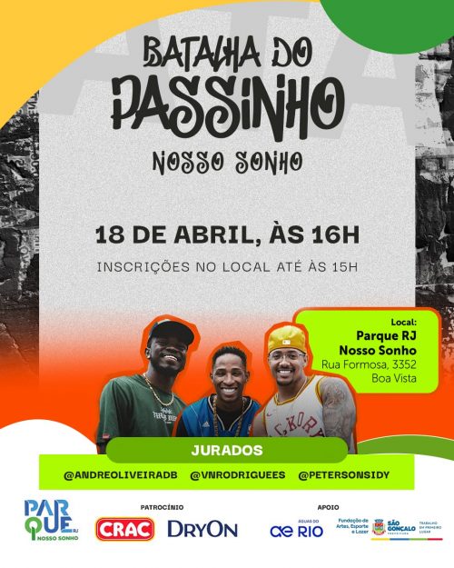 São Gonçalo será palco de mais uma grande celebração da cultura urbana no próximo sábado, 18 de abril, às 16h, no Parque RJ Nosso Sonho, com a realização da Batalha do Passinho Nosso Sonho.