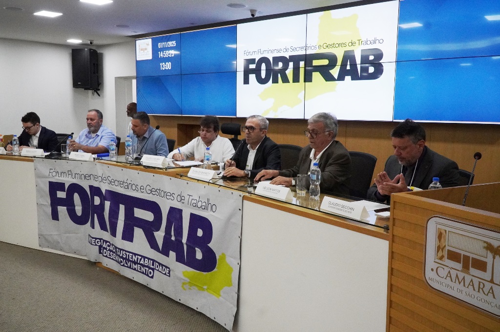 A cidade de São Gonçalo recebeu, nesta tarde de sexta-feira (7), mais uma edição do Fórum Fluminense de Secretários e Gestores de Trabalho do Rio de Janeiro (Fortrab). Esta é a segunda vez que o evento acontece na cidade. O Fortrab reúne secretários municipais de diversas cidades, além de representantes do Ministério do Trabalho e Emprego, membros da sociedade civil, associações e sindicatos. O evento foi realizado no Plenário da Câmara Municipal de São Gonçalo.