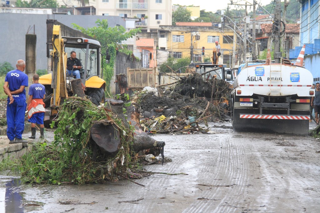 Mais de 500 homens das secretarias de Conservação e Desenvolvimento Urbano da Prefeitura de São Gonçalo atuam, nesta quarta-feira (8), nos pontos atingidos pela forte chuva que castigou a cidade na noite da última terça-feira (7). Pela manhã, as equipes iniciaram os serviços desobstruindo redes de águas pluviais, removendo árvores tombadas e retirando lama e entulho das ruas, inclusive em trecho da RJ-104, na altura do viaduto de Maria Paula.