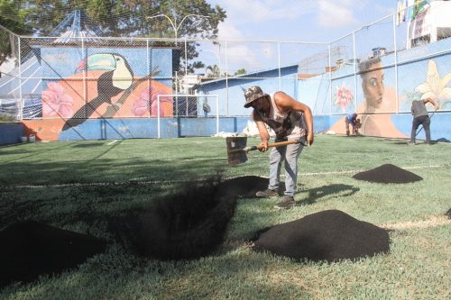 A Secretaria de Conservação da Prefeitura de São Gonçalo está realizando a troca da grama sintética de quadras em praças do município. A mudança se faz necessária após a grama ser danificada devido ao mau uso do espaço. Nesta sexta-feira (6), a instalação da nova grama sintética está sendo finalizada com a colocação da borracha granulada, que amortece impactos, na Praça Jornalista Valfrido Rocha, no Jardim Catarina.