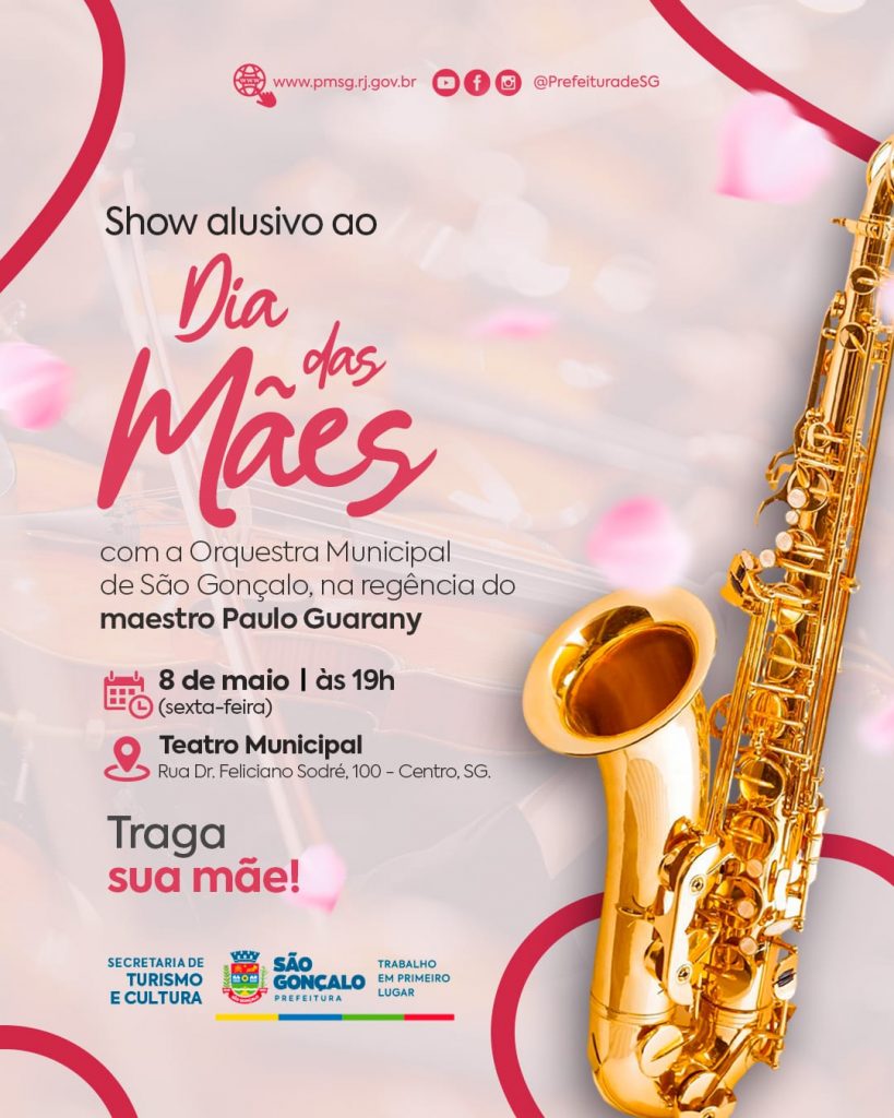 Dia 8: Show alusivo ao Dia das Mães com a Orquestra Municipal de São Gonçalo. Sob a regência do maestro Paulo Guarany, a apresentação contará com um repertório temático especialmente preparado para celebrar a data.
