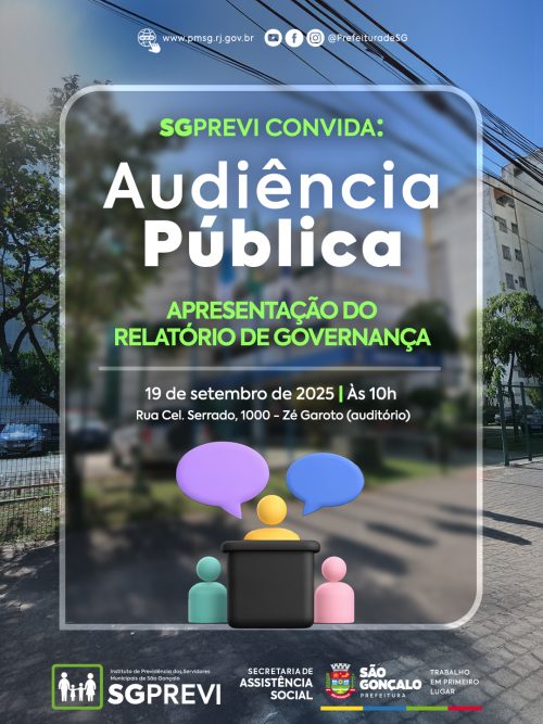 O Instituto de Previdência do Município de São Gonçalo (SG-Previ) vai realizar audiência pública nesta sexta-feira (19), às 10h, em sua sede, na Rua Coronel Serrado, 1000, no bairro Zé Garoto.