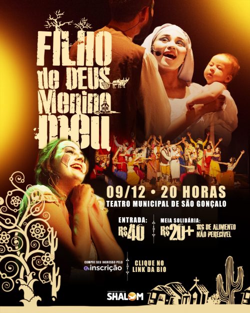 Na terça-feira, às 20h, um musical natalino toma conta do palco com “Filho de Deus, Menino Meu”. Com proposta inovadora, mistura teatro mambembe e diversas linguagens artísticas. A Trupe da Encarnação encena o nascimento do Filho de Deus com humor, música variada (do tango ao pop), dança e estética circense, trazendo uma mensagem de alegria e fé. Com classificação livre, os ingressos estão disponíveis no link: https://www.e-inscricao.com/shalom-niteroi/filho-de-deus.