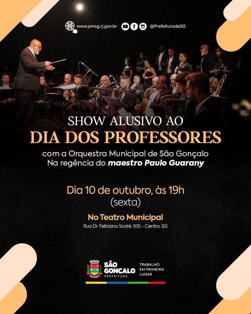 Nesta sexta-feira (10), às 19h, o Teatro Municipal de São Gonçalo estará recebendo um show alusivo ao Dia dos Professores, com a apresentação da Orquestra Municipal de São Gonçalo, sob a regência do maestro Paulo Guarany.