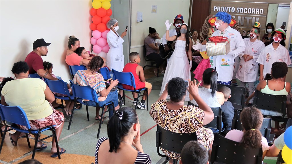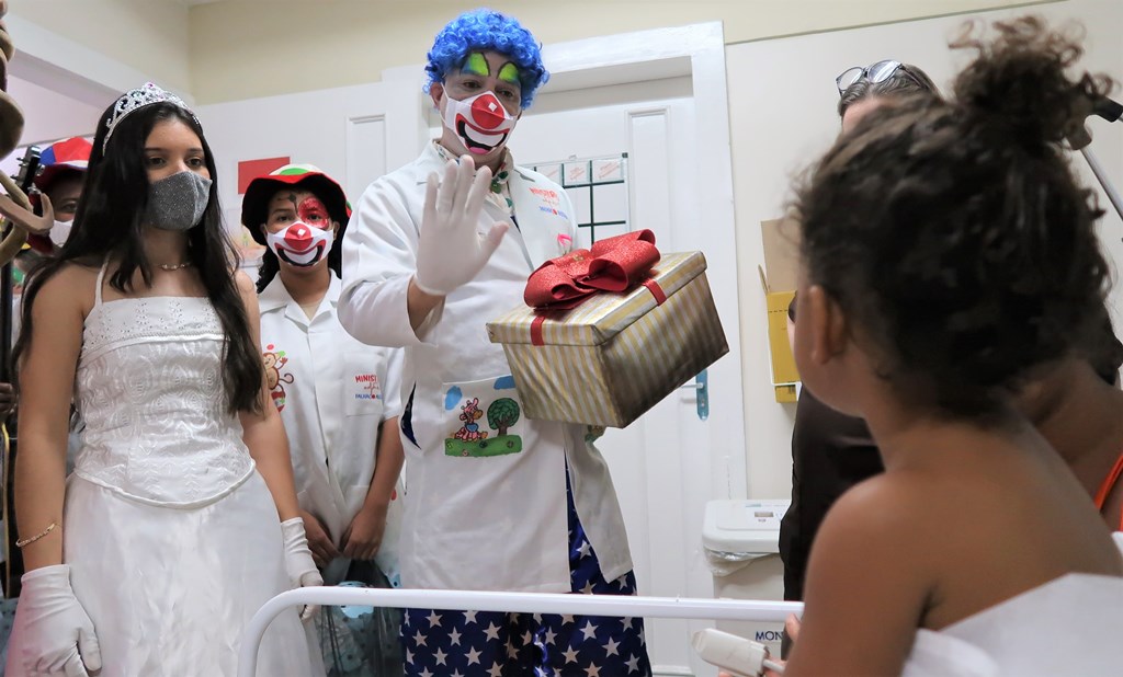 Através de música, violão e mensagens positivas, o grupo percorreu as instalações da unidade, levando alegria e presentes. As crianças que aguardavam atendimento na sala de espera também receberam a presença dos animadores.